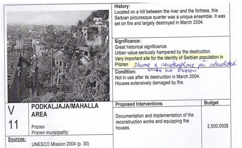 – Nënkalaja e Prizrenit edhe pse botimi është bërë në gjuhën angleze përshkruhet me fjalën serbe “PODKALAJA”, ndërsa për këtë lagje në këtë raport thuhet se është shumë e rëndësishme për identitetin e popullatës serbe në Prizren.