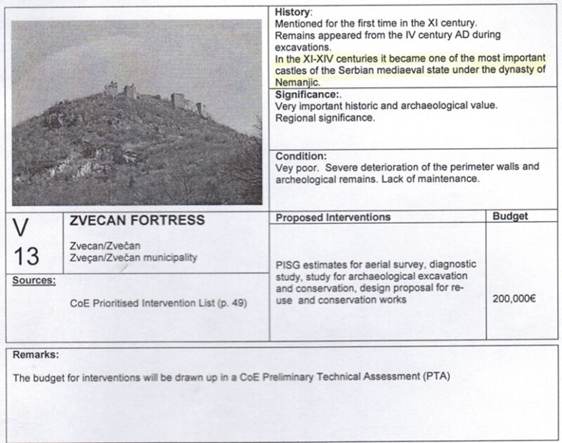 – Kështjella e Zveçanit, për të cilën shkruan se është ndërtuar nga shekujt XI-XIV, dhe është shumë e rëndësishme për shtetin mesjetar serb dhe për dinastinë Nemanjide.