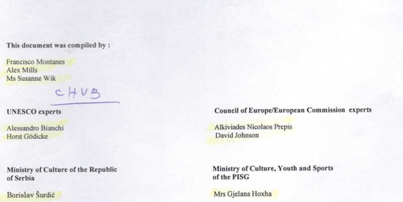 Të dhënat për të gjitha këto monumente u përpiluan në një dokument nga ekspertë ndërkombëtarë dhe vendorë, si: nga CHwB, Suedi: Francisco Mondanes, Alex Mills dhe znj. Susanne Wik, ekspertë të UNESCO-s: Alessandro Bianchi, dhe Horst Godicke, nga Këshilli i Evropës dhe Komisioni Evropian ekspertët: Alkiviades Nicolaos Prepis dhe David Johnson, nga Ministria e Kulturës së Republikës së Serbisë: Borislav Surdić, dhe nga Ministria e Kulturës Rinisë dhe Sportit znj. Gjejlane Hoxha.