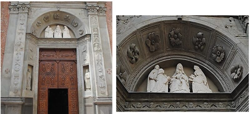 Në harkun (lunetta) mbi portën e kishës, janë tre grupe skulpturash në mermer të bardhë, në qendër Shen Maria me Jezusin foshnje, në anën e djathtë skukpturat e Gulielmit VIII dhe të vëllait Bonifaci III, ndërsa majtas Maria Paleologa me djalin Gulielmi IX.