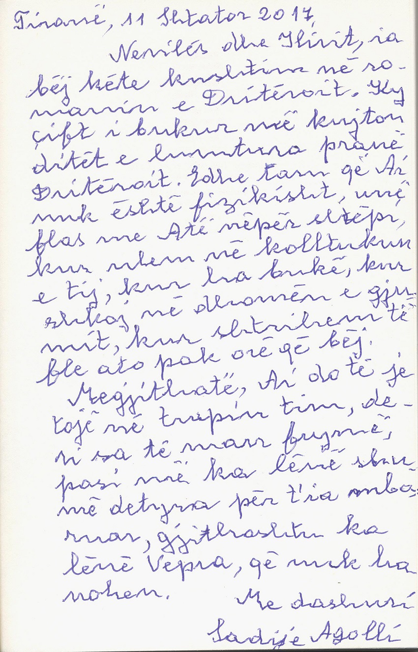 Do mbetet një nga pengjet e mëdha të jetës time që nuk munda të isha i pranishëm në përcjelljen e saj, në udhën drejt Amëshimit! Një arsye përtej pamundësive të mija më pengoi për të mos qenë i pranishëm ditën e Lamtumirës për Gruan Fisnike, e cila me mirësinë, dashurinë dhe dhimbjen e bukur të saj, e fisnikëroi edhe më shumë Dritëroin tonë, miqtë dhe të gjithë njerëzinë, anembanë Shqipërisë. Në faqen e brendëshme të kopertinës në romanit e Dritëroit “Trëndafil në gotë” të cilin na e dhuroi kohët e fundit, Sadija shkruan: “Nevilës dhe Ilirit, ia bëj këtë kushtim në romanin e Dritëroit. Ky çift i bukur më kujton ditët e lumtura pranë Dritëroit. Edhe tani që Ai nuk është fizikisht, unë flas me Atë nëpër shtëpi, kur ulem në kolltukun e Tij, kur ha bukë, kur shkoj në dhomën e gjumit, kur shtrihem të fle ato pak orë që bëj. Megjithatë, Ai do të jetoj në trupin tim, derisa të marrë frymë, pasi më ka lënë shumë detyra për t’ia mbaruar, gjithashtu ka lënë vepra, që nuk harrohen. Me dashuri, Sadije Agolli – Tiranë, 11 Shtator, 2017”. Ky kushtim, është një prej disa nga kujtimet që ne si familje kemi nga miqësia jonë mbi 30 vjeçare me të pavdekshmit Dritëro dhe Sadije Agolli. Dy javë, para se ajo të niste rrugëtimin e saj pa kthim, biseduam gjatë në telefon. Folëm për Dritëronë që ajo e deshi aq shumë dhe e vuajti prej 2 vjetësh deri në asht ikjen e Tij. Biseduam për shumë gjëra të bukura, për kujtimet e shumta që kishte dhe i ruante përgjatë 52 viteve të jetës bashkëshortore me Njeriun që jetoi, pulsoi e frymoi çdo çast e sekondë pranë Tij. Më foli për planet dhe detyrat që i kishte vënë vetes si të vetmen mënyrë për të mposhtur dhimbjen, duke mbledhur e sistemuar fletë për fletë, çdo copë letër e shënim, çdo dorëshkrim të Dritëroit. Ndjeva në fjalët që më thoshte se, jetonte si askush tjetër çdo çast e në çdo qelizë të trupit të saj të brishtë me dhimbjen e mungesës së Tij. Ndaj dhe m’u krijua përshtypja se fisnikja Sadije e kërkonte me dëshirë e ngulm ikjen e saj nga kjo botë, ngase nuk qëndronte dot më në këtë pritje të gjatë që e mundonte… Iku shpejt për të mos e lënë vetëm Njeriun që e deshi më shumë se veten, Bashkëshortin shembullor, Babain ideal e të dhembshur, Prindin model, Gjyshin e ëmbël të nipërve e mbesave, Intelektualin sipëror, Edukatorin e pashembullt të vegjëlisë, Vëllain, Poetin, Mikun e të gjithëve ne. Ikën si dy shtërgje të fundit njëri pas tjetrit në udhëtimin e largët, larg zhurmës prej të gjallëve, ngase ata të dy kurrë nuk ishin mësuar të qëndronin pa njëri tjetrin… Ikën duke na lënë pas një dashuri të pamatë, por edhe një dhimbje të madhe në eter për ne të gjallët e përkohëshëm, që nuk po mundemi të mësohemi me mungesën e tyre fizike. Na lanë pas një mal me kujtime, një det me dashuri, një oqean me mirësi, një vepër të pavdekshme që do të mbijetojë ndër breza. Faleminderit Elona dhe Artan që më çelët portat e kujtesës për të thënë fjalët e zemrës e të dhimbjes për dy Njerëz të mrekullueshëm që aq shumë i kam dashur, aq shumë i dua dhe do t’i kujtoj gjithë jetën, për çka ata ishin, janë e do të mbeten, për gjithçka na dhuruan plotë mirësi, fisnikëri e bujari…