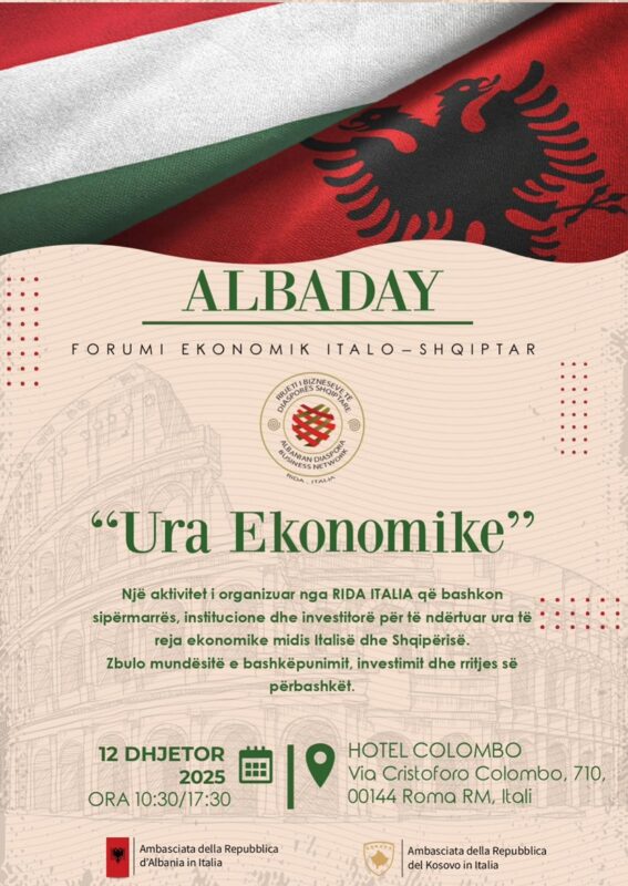 Romë, 12 dhjetor — Pas suksesit të madh të forumit të parë “Albaday”, zhvilluar më 26 prill në Hotelin Ndërkombëtar në Tiranë, vëmendja tashmë është drejtuar nga ngjarja e radhës që synon të forcojë bashkëpunimin ekonomik midis Italisë dhe Shqipërisë: Forumi Ekonomik “Ura Ekonomike”, i cili do të mbahet më 12 dhjetor në Romë, në hotelin “Colombo”.