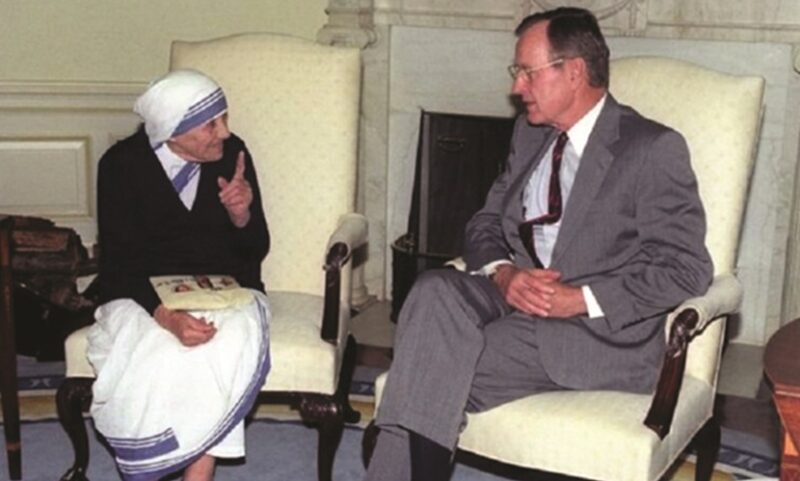 Më 9 dhjetor 1991, në Zyrën Ovale të Shtëpisë së Bardhë, Ëashington, DC, Presidenti amerikan George H.W. Bush u takua me murgeshën shqiptare Gonxhe Bojaxhiun, Nënën Terezë (Shën Tereza e Kalkutës)