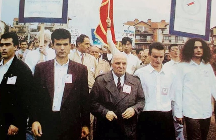 Foto nga arkivi i demonstratave të 1 tetorit 1997 (Në rreshtin e parë, nga e djathta: Albin Kurti, Driton Lajçi, Rektori prof. dr. Ejup Statovci, Bujar Dugolli dhe Muhamet Mavraj)
