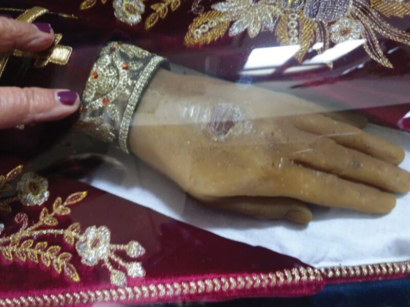 Dora e majtë e Shen Nënë Angjelinës, me stigmën (shenjën) në shpinën e dorës, e ruajtur në kuti xhami.