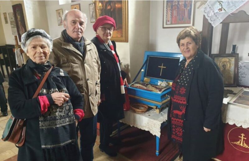 Lavdie Bisha, Kristo Goçi, Vllasova Musta dhe Zenepe Luka, ne kishën Shen Nënë Angjelinës, para kutisë me xham, ku ruhet dora e majtë e Shen Nënë Angjelinës Arbërore.