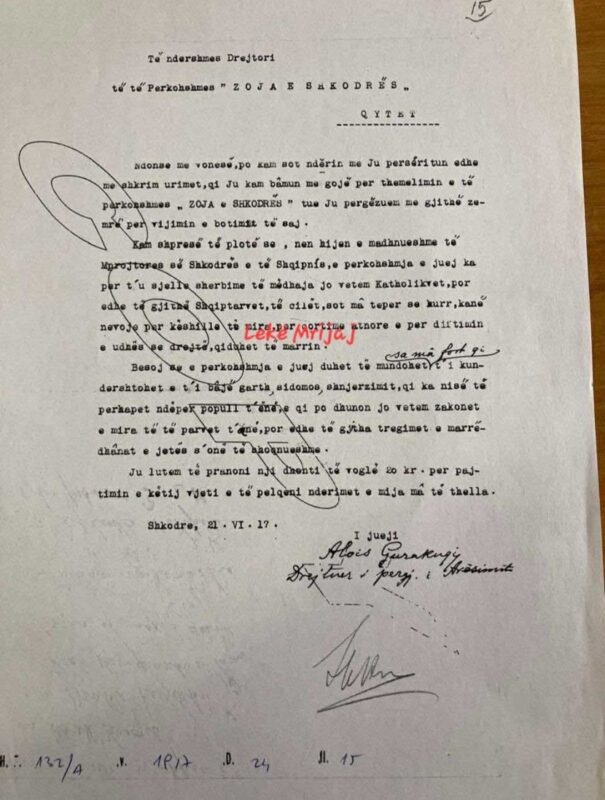 Gjatë kësaj pune kërkimore, pata fatin të zbuloj një dokument tejet të rëndësishëm, pra, një letër origjinale e datës 21 qershor 1917, e firmosur nga vetë Alois/Luigj Gurakuqi, e ruajtur me përkushtim në arkivat e vjetër, por e paekspozuar deri më sot për publikun e gjerë dhe studiuesit. Ky zbulim përfaqëson një dritare të hapur drejt mendimit, ndërgjegjes qytetare dhe vizionit kulturor të Gurakuqit, duke na mundësuar të depërtojmë më thellë në universin e tij shpirtëror e intelektual, në një periudhë tepër të ndjeshme për fatet e Shqipërisë.