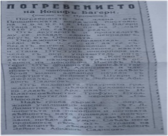 Gazeta “RODINA”, që botohej në Shkup, në nr. 52 të 15 majit 1916 do ta botojë një shkrim me titull “Pogrebenieto na Josif Bageri” (letër nga Prishtina), duke e përshkruar varrimin që do të bëhej pas një viti. Sipas këtij artikulli, varrimin e Josif Bagerit do ta inicojë një mik bullgar i Josifit, që e kryente detyrën e inspektorit të Arsimit për Rrethin e Prishtinës, e i cili e kishte njohur Josifin që në Sofje.
