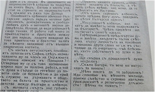 Në bazë të këtij artikulli e mësojmë edhe se, si duket, bullgarët e kishin emëruar Josif Bagerin anëtar të Komisionit të Përhershëm Administrativ të Rrethit të Prishtinës, ku do të punonte, ashtu siç do të shprehet inspektori pranë varrit të tij, “me zemër dhe shpirt në përforcimin e miqësisë ndërmjet shqiptarëve dhe bullgarëve”. Andaj, “me vdekjen e tij ne humbëm një fuqi të pazëvendësueshme”