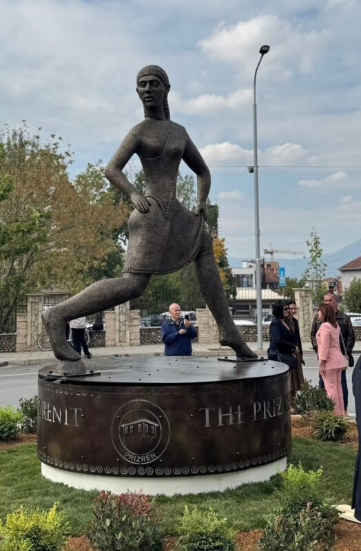 Arti tejkalon origjinalitetin i jep hijeshi, ritëm dhe bukuri. Shpirti i artistit vezullon nga ndërdija e tij përtej çdo realiteti duke i mbetur besnik realitetit. 11. 4 cm e lartë, e zbuluar në vitin 1876 në Prizren ndërsa daton rreth viteve 520 -500 p.e.s. Skulptori Gëzim Muriqi jetësoi një figurinë që shpirti i njeriut tashmë merr frymë me të. Ajo lëvizë dhe dialogun fuqishëm me atë qëndrueshmëri reale e pak edhe nuanca artistike që thyen realitetin e asaj që është dhe që duket tashmë. Formësohet si një figurë femërore në akt vrapimi e trashëguar nga linjat e klasikes por e trajtuar me një sens modern të ritmit dhe volumit. E ngjashme me figurinë veçse koka e saj është e ngritur si porosi. Pozicioni i trupit, kërcimi i një këmbë ndaj tjetrës, dhe tensioni i muskujve të perceptueshëm në siluetë krijojnë një iluzion dinamik që sfidon masën e brendshme të materialit. Ta shohësh një figurinë miniaturë në përmasa aq të mëdha, truri kërkon të njohurën dokumentaren për të cilën flet arkeologjia, por arti vazhdon përjetësinë me këtë figurë. Trupi i saj ka elegancë, elasticitet sportiv dhe skulptori bartë figurinën mbi supet e tij në skulpturë, gjithmonë me metodën tij. Liria e artit është përtej çdo fakti dhe vet skulptura tenton ta kufizoj autorin derisa autori ndjen një lehtësim shpirtëror duke e ndjerë vet veprën e pastaj imituar rolin dhe kompozicion e saj. Shpejtësia dinamike e figurinës merr frymë në skulpturën e Muriqit. Dritat që përplasen lehtë mbi trupin e saj krijojnë hije te drapëria e supeve, këmbëve. Drita në skulpturë ka shumë rëndësi sepse perceptimin optik të shikuesit mund ta ndryshojë, në këtë rast ajo dialogun me veprën sikur skulptori në përmasa të mëdha bënë matje të saktë të dritës me hijes, hapësirës dhe materies. Gjithçka ndryshon në kohë dhe hapësirë dhe vet forma krijon këtë iluzion dhe Muriqi me studimin e tij shkencor arrin të kap këtë siluetë. Pra, qartësi të formës së vrapueses, në tërësi kompozicionin.